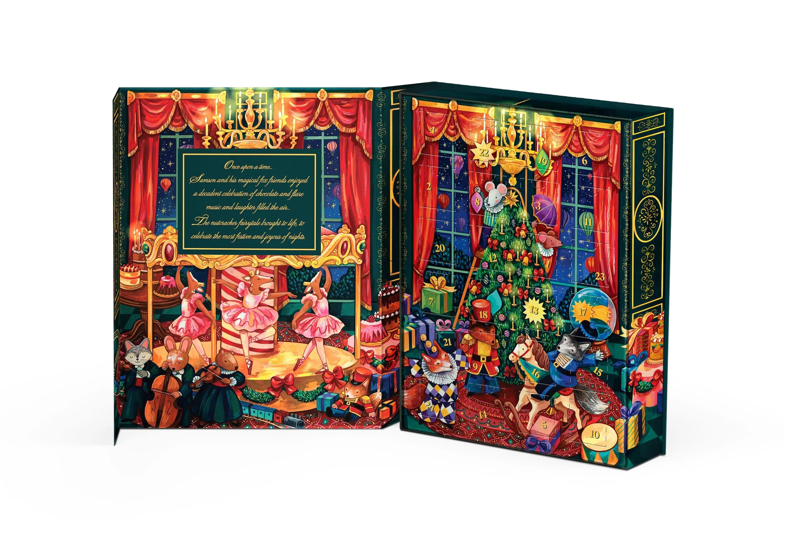 This year’s traditional Advent calendar from Hilliards Chocolates depicts a cozy living room scene complete with a fireplace and table stacked with chocolates and other treats. Inside it’s filled with 24 pieces of milk chocolate from the historic Massachusetts family-owned-and-operated chocolatier. The artwork on the box was created by their window artist, Jonathan Winchell. Each piece of chocolate is wrapped like a tiny Christmas present and features a sweet seasonal saying.