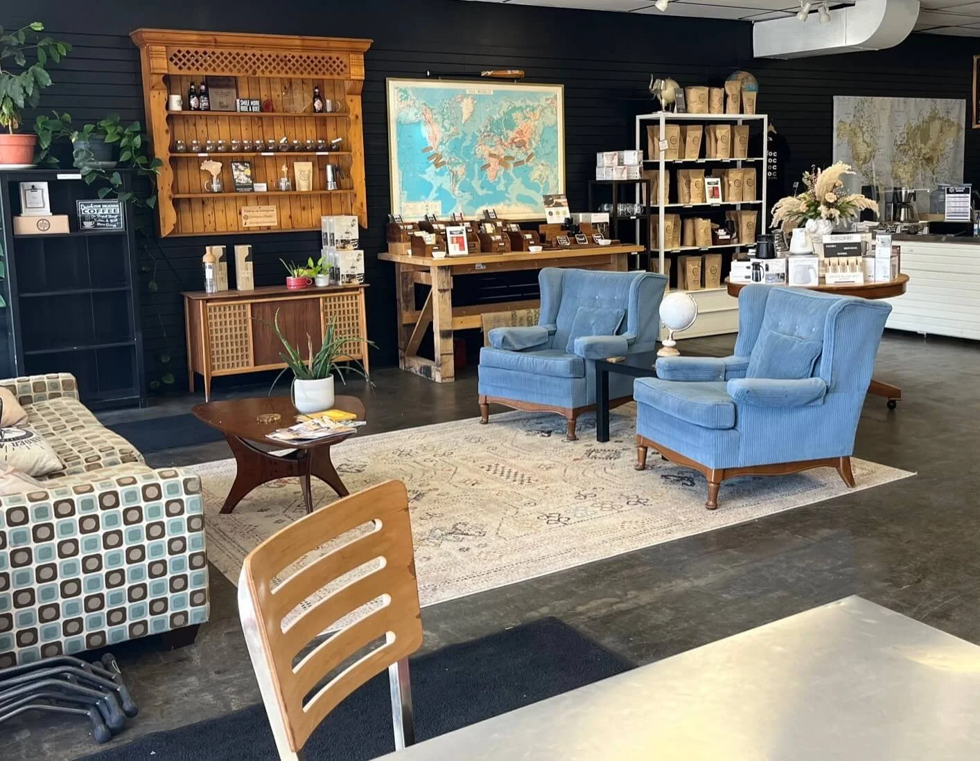 Rodriguez initially designed this space to function as a bike shop that also sold packaged coffee. “When the bike shop left in 2018, it gave me enough space to [create a café], with seating for 19. I am very much a do-it-yourself person so most every furnishing in the shop had a different life elsewhere.”